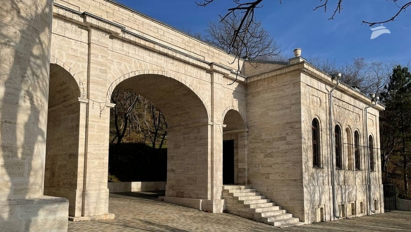 Величественное здание 1828 года в стиле классицизма находится у входа в парк Цветник. Это — НИИ курортологии, но первоначально здесь располагалась ресторация. В ней была и гостиница, и банкетный зал, и минеральные ванны.