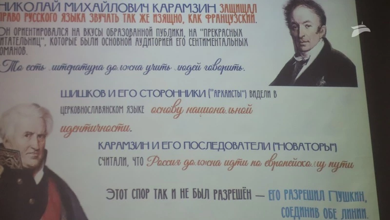Лектор упомянула о спорах участников клуба «Любителей русского слова» на примерах писателей Николая Карамзина, использовавшего в своём творчестве множество французских слов, и его оппонента — Александра Шишкова, выступавшего за полный отказ от иностранных слов и их замену на аналогичные русские.