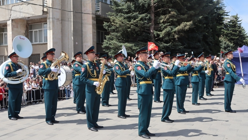 Под звуки гимна Великой Победы — песню «День Победы» ведущие перечисляли достижения пятигорских военных: сражения на фронтах Великой Отечественной войны, выполнение военных операции в ходе локальных конфликтов в Афганистане, Сирии, Вьетнаме, Венгрии, Эфиопии, Египте, Йемене, Анголе, Северной Корее; обеспечение успеха контртеррористических операций в регионах Северного Кавказа, защиту жителей Южной Осетии и Абхазии.
