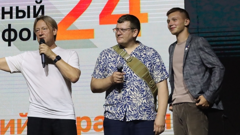 Затем для исполнения легендарного хита «Не вешать нос!» на сцену поднялись двое молодых людей. Он подпевали артисту в припевах, а после поздравили жителей с грядущим Днём города.