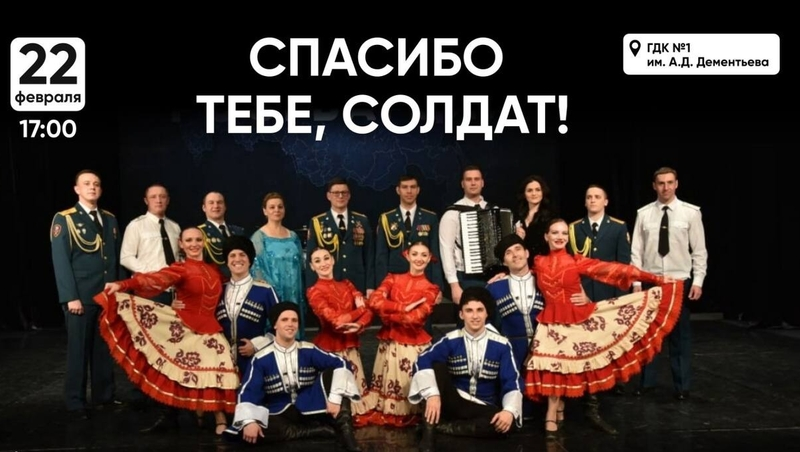 Начало в 17:00. Мероприятие состоится в ГДК №1 им. А.Д.Дементьева. Перед зрителями выступит ансамбль песни и пляски Северо-Кавказского ордена Жукова округа войск национальной гвардии РФ с программой «Спасибо тебе, солдат!».