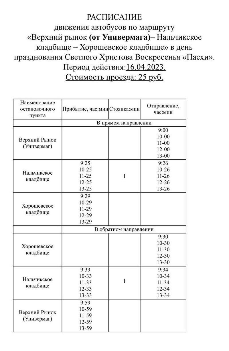 В Пятигорске 16 апреля из-за просьб местных жителей организовали движение общественного транспорта от Верхнего рынка до кладбищ Нальчикского и Хорошевского. Изменения движения общественного транспорта связаны с пасхальными праздниками. Первый рейс отправится в 9:00, а последний — в 13:00. Стоимость проезда по маршруту — 25 рублей.