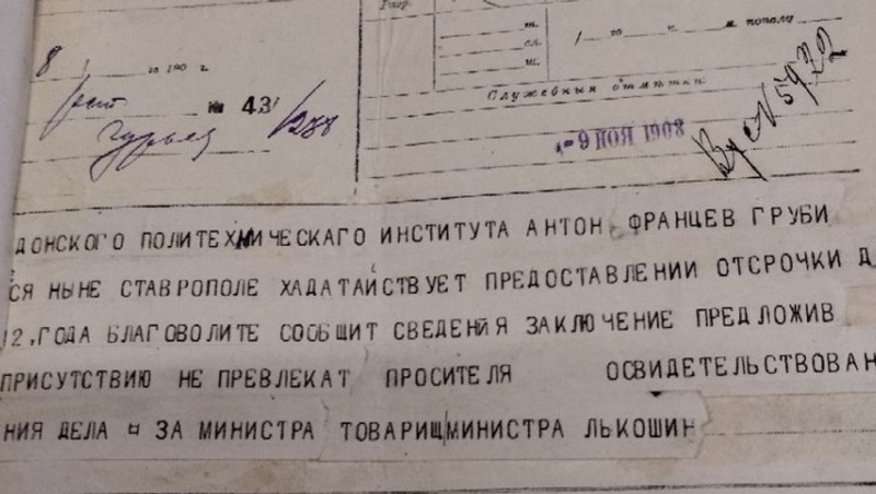 «Названное Министерство по соглашению с Министерством торговли и промышленности и Военным Министерством признало возможным предоставить слушателю Донского политехнического института Антону Груби отсрочку по исполнению воинской повинности до призыва 1912 года»,