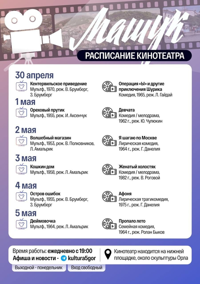 На этой неделе горожанам пройдут бесплатные кинопоказы шести фильмов (16+) и шести мультфильмов (0+). Среди них будут «Ореховый прутик», «Кошкин дом», «Операция «Ы» и другие приключения Шурика», «Афоня» и т. д.