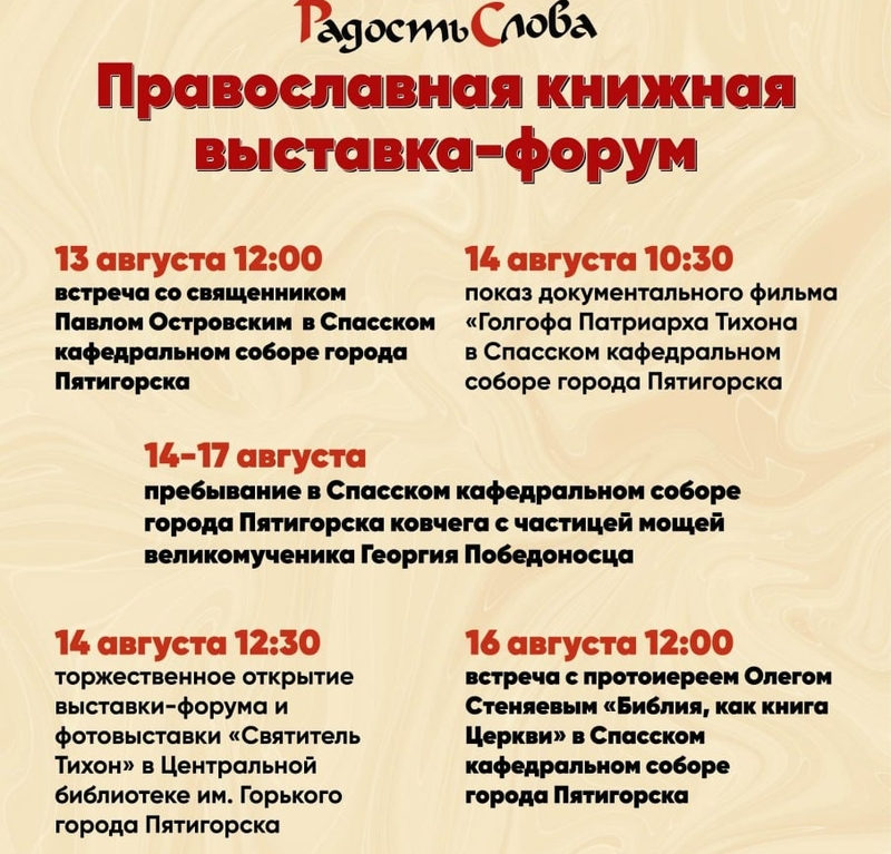 Программа форума предусматривает конференцию, фотовыставки и показ документального фильма. Кроме того, в рамках мероприятия состоятся встречи со священнослужителями. Подробное расписание всех событий — в афише.