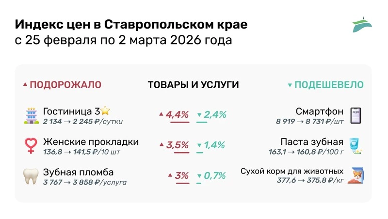 В сфере товаров и услуг наиболее значительное подорожание затронуло туристов. Проживание в трёхзвёздочных гостиницах выросло на 4,4% — до 2 245 руб. за сутки с человека. Среди подешевевших товаров лидируют смартфоны — 8 731 руб. за устройство, что ниже на 2,4%.