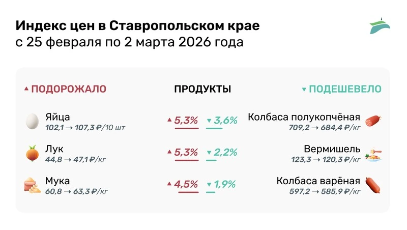 Среди продуктов наибольший рост цен зафиксирован на куриные яйца — с 102,1 до 107,3 руб. за десяток, что составляет 5,3%. Больше всего снизилась за неделю стоимость колбасных изделий. Полукопчёная и варёно-копчёная колбаса теперь стоит 684,4 руб. за кг, что меньше на 3,6%. Подробнее — в инфографике «Победы26».