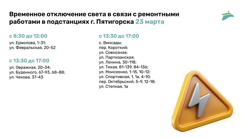 Отключение связано с ремонтом на подстанциях Пятигорска. Оно коснётся города-курорта и села Винсады.