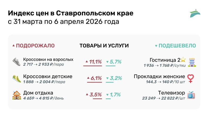 Наибольший рост среди непродовольственных товаров и услуг показали кроссовки — 11,1%. Теперь пара обуви на взрослых стоит в среднем 2 933 руб. Зато суточное проживание в двухзвёздочных гостиницах Ставрополья теперь обходится примерно в 1 768 руб. Цена упала на 5,7%.
