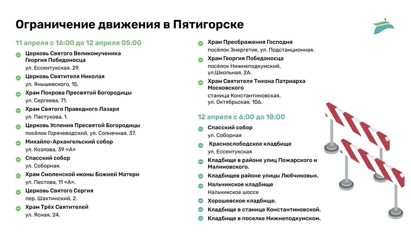 Кроме того, 12 апреля с 6:00 до 18:00 в городе также будут недоступны дороги к семи кладбищам. Ограничения не коснутся маршруток и автобусов. Подробности — в инфографике «Портала Пятигорска».