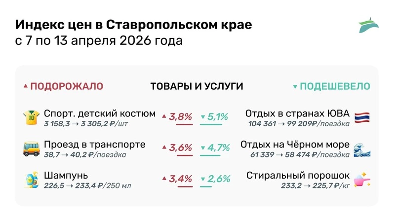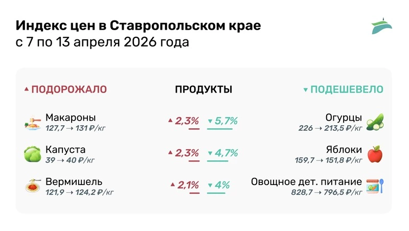 Макароны подорожали на 2,3% и теперь в среднем стоят 131 руб. за кг. В категории товаров и услуг зафиксирован рост цен на спортивный детский костюм — до 3305 руб. за штуку. До 40,2 руб. выросла средняя цена и поездки в городском автобусе. Подробнее — в инфографике «Портала Пятигорска».