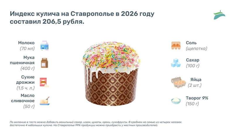 В расчёт стоимости вошли основные продукты: мука, творог, сливочное масло, яйца, сахар, молоко и дрожжи. По вкусу в тесто также добавляют изюм, орехи или цукаты. Подробнее — в инфографике «Портала Пятигорска».