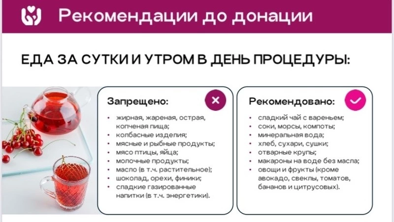 Медики напоминают, что стать донором может любой здоровый человек старше 18 лет и весом не менее 50 кг. За сутки перед донацией рекомендуют придерживаться специальной диеты, а после процедуры уделить внимание восстановлению организма.
