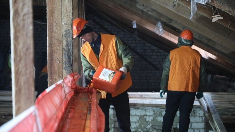 По проекту демонтировали старое кровельное покрытие, частично заменили разрушенные элементы стропильной системы, сделали парогидроизоляцию, смонтировали новое кровельное покрытие из металлопрофиля, установили снегозадержатели и ограждения, восстановили вентиляционные каналы и водосточную систему.