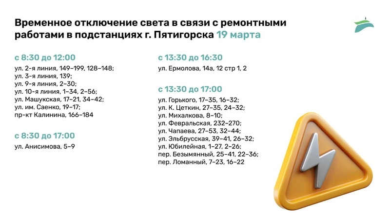 С 13:30 не будет света на улицах Ермолова, Горького, К. Цеткин, Михалкова, Февральской, Чапаева, Эльбрусской, Юбилейной, а также на переулках Безымянном и Ломанном. На Ермолова электричество вернут к 16:30, остальным абонентам — к 17:00.