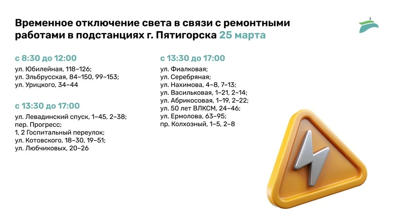 Техническое обслуживание оборудования направлено на предотвращение аварийных ситуаций. Работы разделены на два этапа: утренний (с 8:30 до 12:00) и дневной (с 13:30 до 17:00). Все адреса и графики отключений указаны в инфографике «Портала Пятигорска».